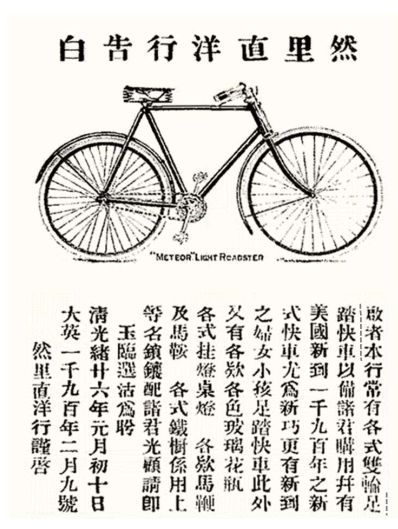 Terms such as ziyouzutache (free foot-pedal vehicle) also began appearing in newspapers around the same time. Compared with other names that appeared during this period, ziyouzutache was more formal and closer to the written language. It is likely that the newspaper literati had modified the term based on the earlier name zutakuaiche (speedy foot-pedal vehicle). The modifier ziyou (free) was added to the original term to indicate that the vehicle was not driven by an external force, thus distinguishing it from the first-generation “motorcycles”, which were powered by machines.