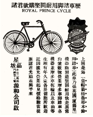 Bicycles became very popular and widely used in Singapore in the 1890s. Thanks to the Singapore Chinese-language paper Lat Pau, which was already in print then, valuable documentary records on the naming of the vehicle remain. In an 1892 advertisement in Lat Pau, the bicycle was termed as jiaotakuaiche (speedy pedal vehicle).