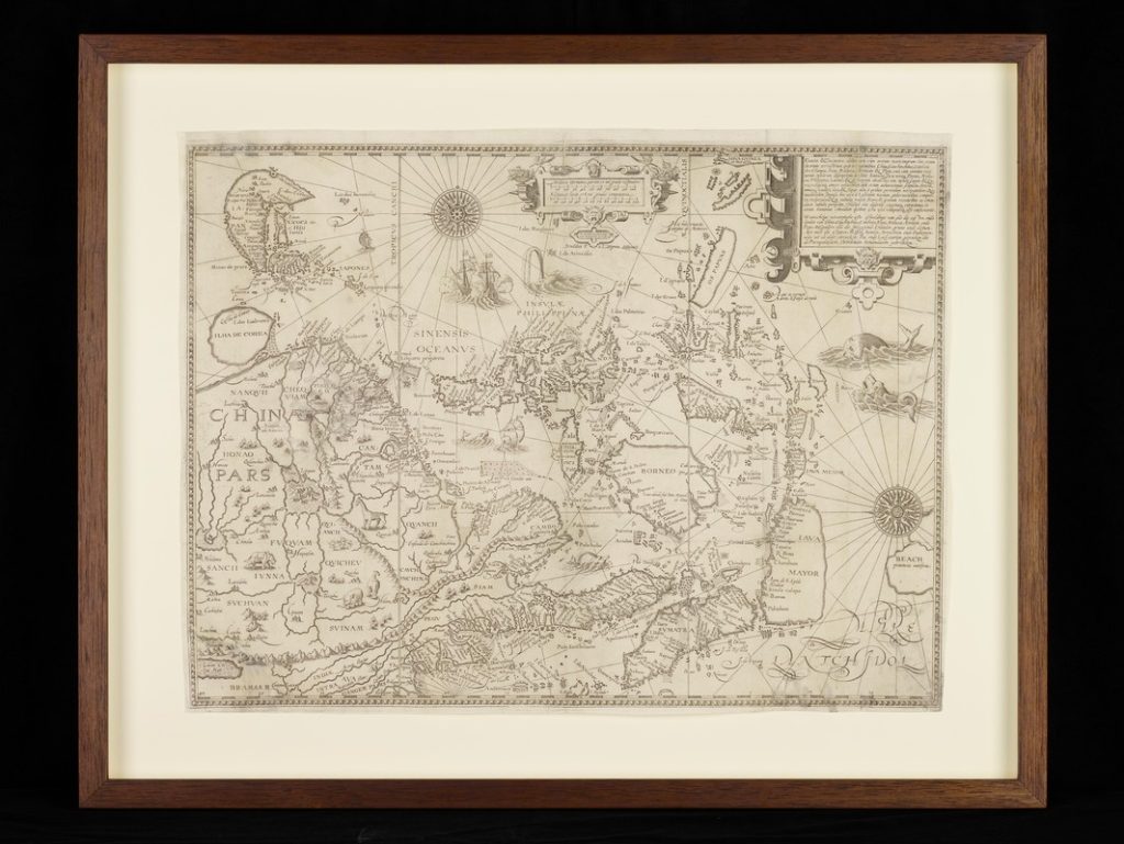 林斯霍滕绘制的东南亚地图,1595年。该地图将位于马来半岛南端的新加坡标注为“Sincapura”。(新加坡国家博物馆馆藏,新加坡国家文物局提供)