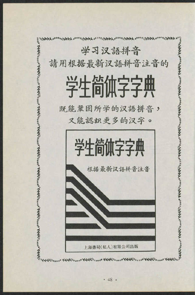 读本中附有一则广告,介绍一部采用汉语拼音注音的汉语字典。《汉语拼音读本》,页48。(取自新加坡国家图书馆网站)